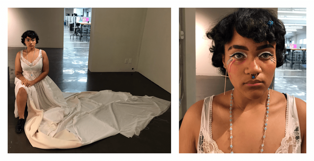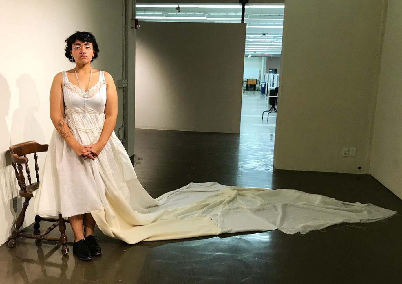 Role Fulfillment 2019Performance, Constructed Wedding Dress Made from Various Found Fabrics6 min, 10′ long dress